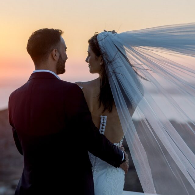 Το απέραντο γαλάζιο του Αιγαίου, το μαγευτικό ηλιοβασίλεμα και τα βλέμματα όλο συναίσθημα χάρισαν στο ζευγάρι ένα ονειρεμένο γαμήλιο άλμπουμ.