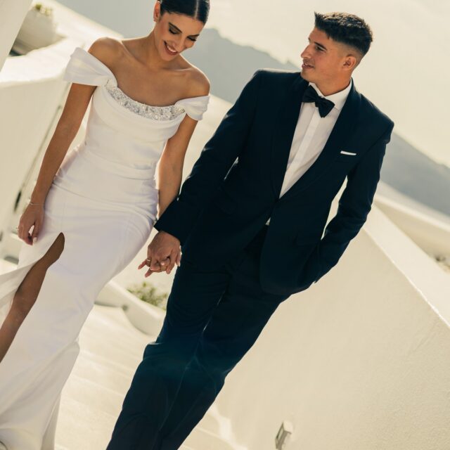 Το απέραντο γαλάζιο του Αιγαίου, το μαγευτικό ηλιοβασίλεμα και τα βλέμματα όλο συναίσθημα χάρισαν στο ζευγάρι ένα ονειρεμένο γαμήλιο άλμπουμ.