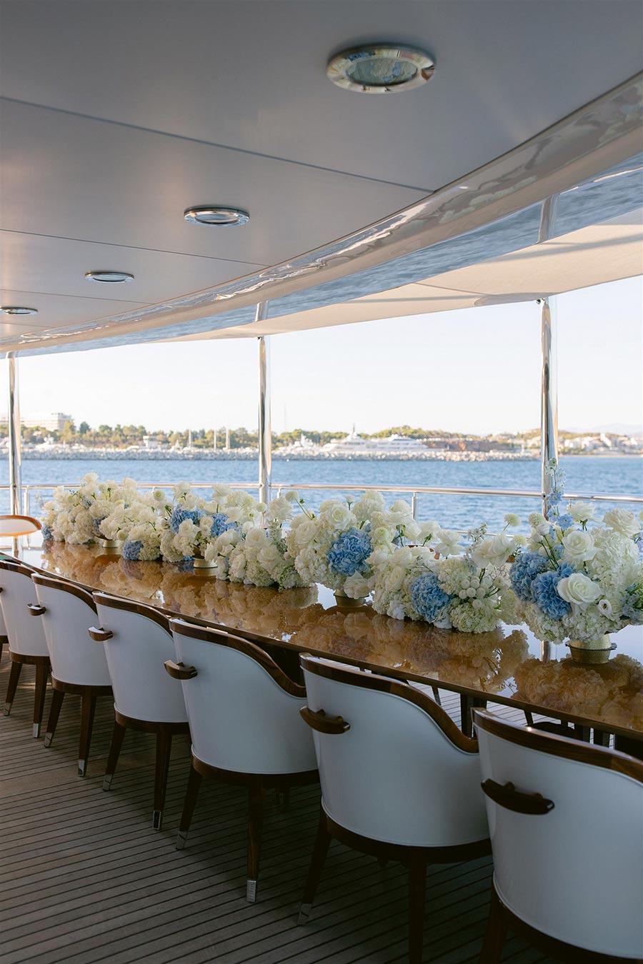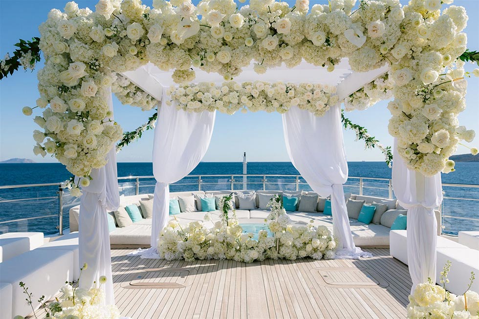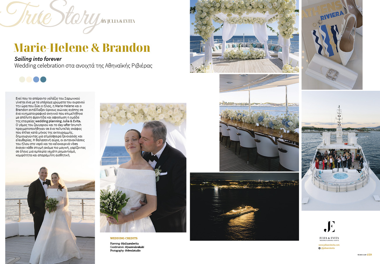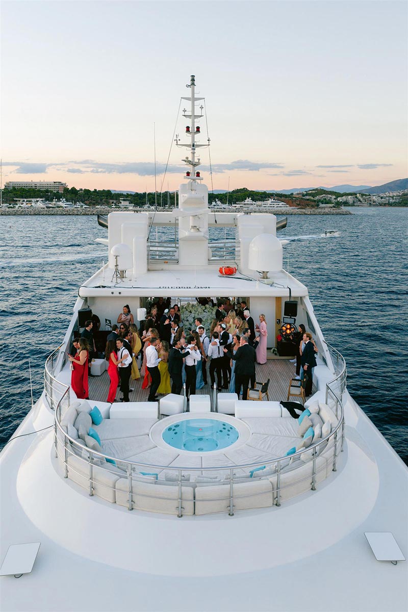 Ο γάμος του ζευγαριού και το day-after brunch πραγματοποιήθηκαν σε ένα πολυτελές σκάφος που έπλεε κατά μήκος της ακτογραμμής, δημιουργώντας μια ατμόσφαιρα ξενοιασιάς και ελευθερίας. Η θαλασσινή αύρα, οι αντανακλάσεις του ήλιου στο νερό και τα καλοκαιρινά vibes έκαναν κάθε στιγμή ακόμα πιο μαγική, χαρίζοντας σε όλους μια εμπειρία γεμάτη ρομαντισμό, κομψότητα και απαράμιλλη αισθητική.