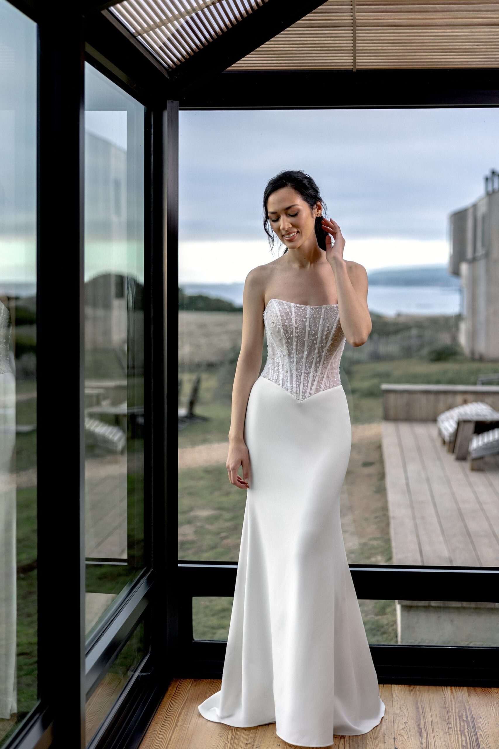 Fit and flare νυφικό από κρεπ ύφασμα με scoop λαιμόκοψη και basque μέση, που αποτελεί ένα από τα κορυφαία bridal dress trends του 2026.