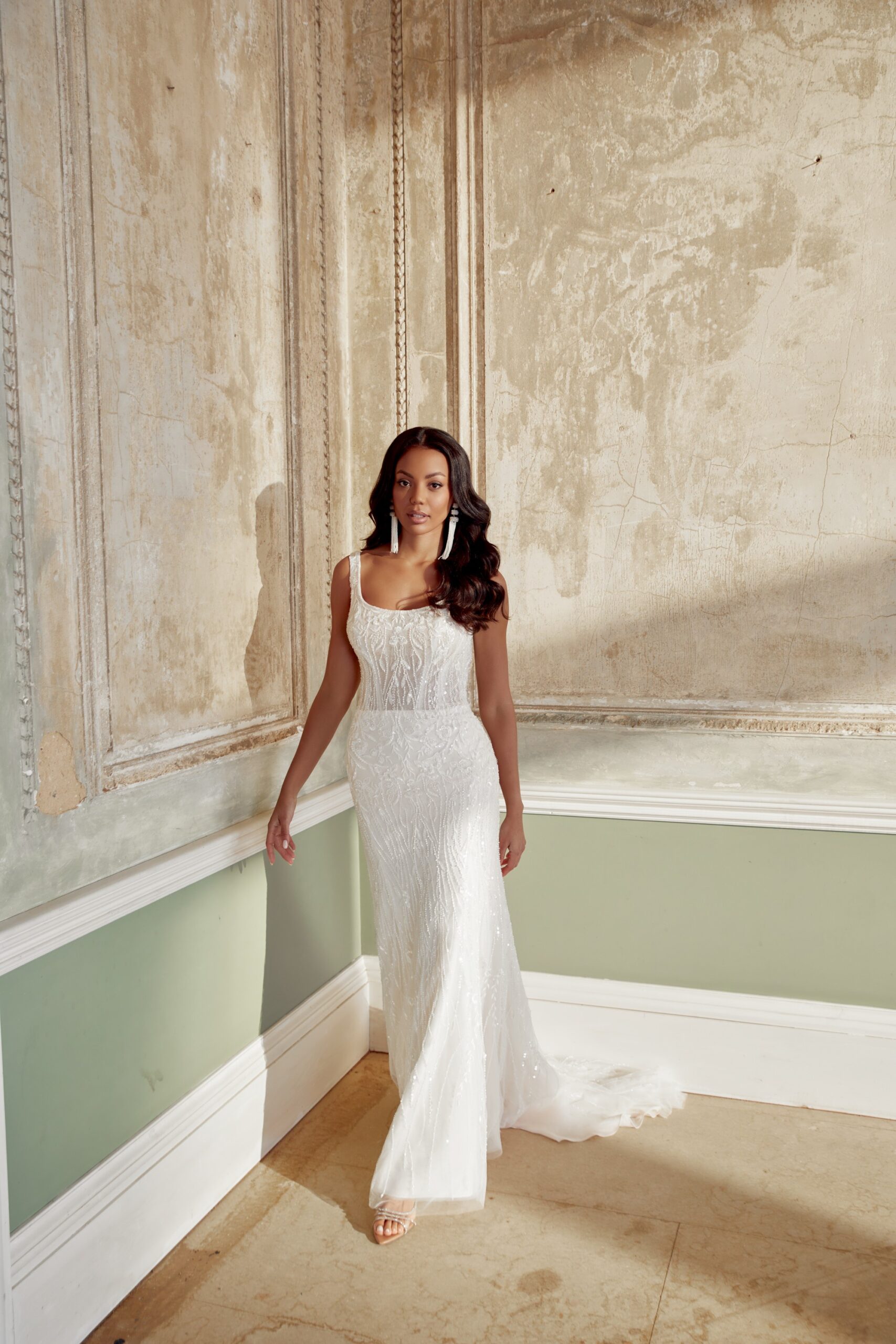 - Fit and flare νυφικό από τούλι, κεντημένο με χάντρες σε όλο το μήκος του, με scoop λαιμόκοψη και chapel ουρά που χαρίζει αέρινη κίνηση.