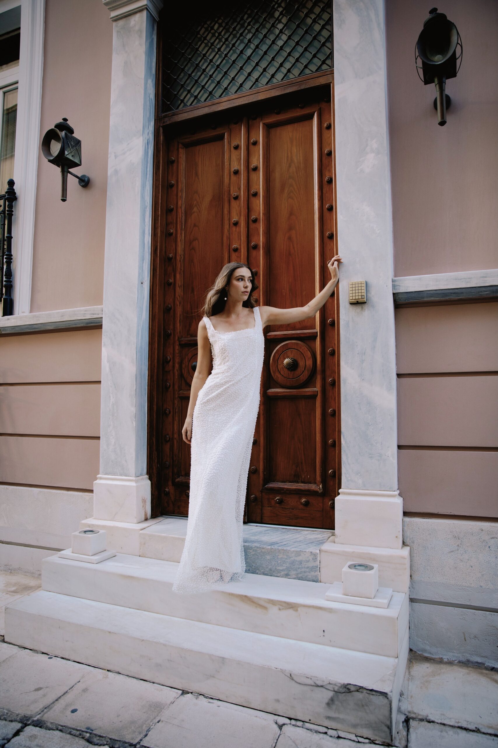 Και αφού η κάθε μία από εμάς διάλεξε τα δύο αγαπημένα της νυφικά, αποφάσισα να μας βάλω ένα challenge: να βρούμε ένα bridal gown Georgia Sini που μας ενθουσιάζει και θα το φορούσαμε σίγουρα όλες. Δύσκολο το task, αλλά… τα καταφέραμε. Είναι αυτό που βλέπετε, ένα νυφικό-ωδή στη θηλυκότητα και τη μοντέρνα κομψότητα, με τετράγωνη λαιμόκοψη, σε ίσια, all-time classic γραμμή και διακοσμημένο με πέρλες.