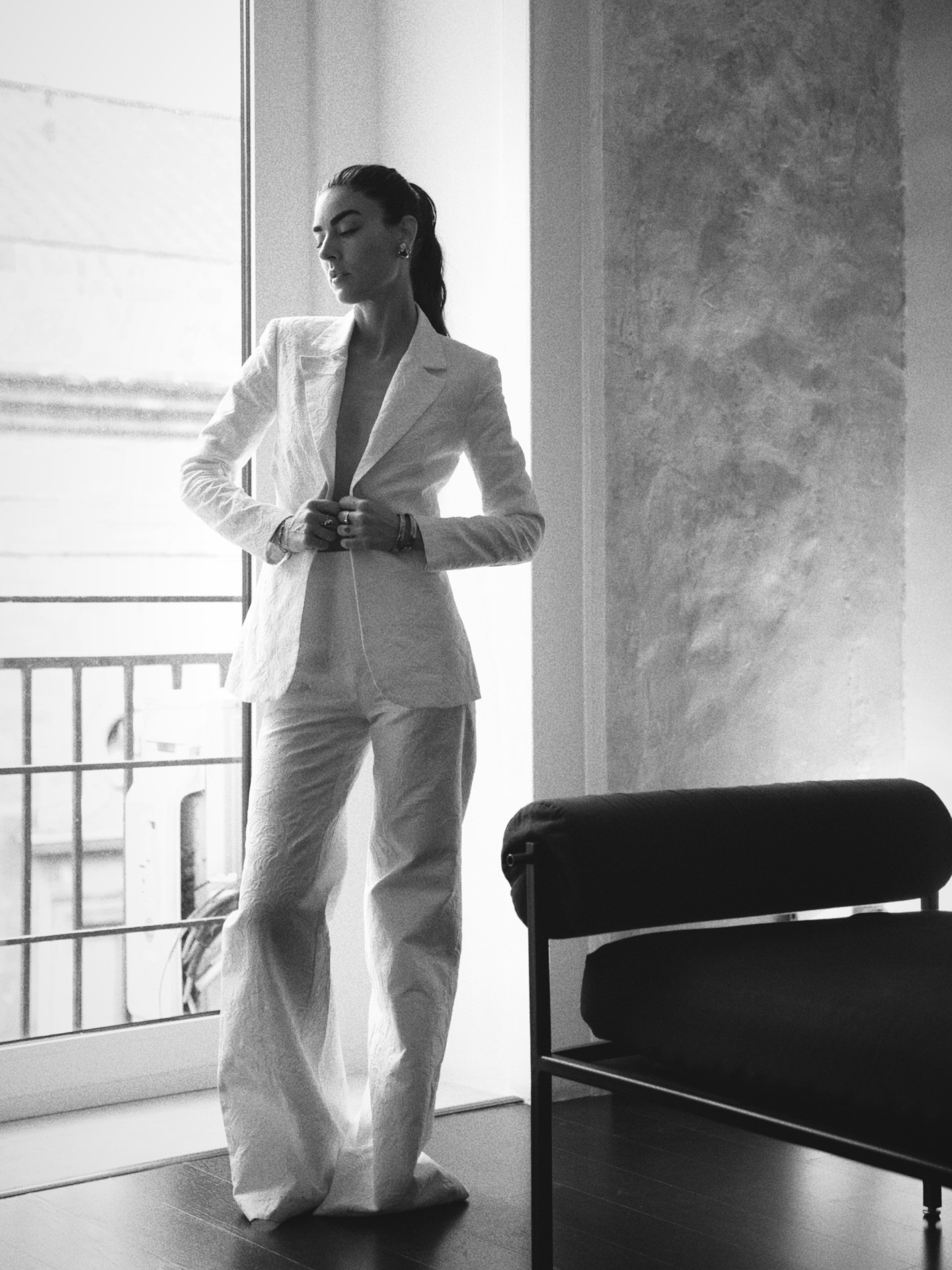 «Αν παντρευόμουν αύριο με πολιτικό γάμο, σίγουρα θα επέλεγα αυτό το power bridal suit». Ακριβώς αυτά τα λόγια είπα στα κορίτσια στο γραφείο, μόλις αντίκρισα για πρώτη φορά το ultra chic, ολόλευκο κοστούμι Georgia Sini. Έχει brocade ύφασμα που προσδίδει ρετρό αισθητική, αποτελείται από ψηλόμεσο, flare παντελόνι που επιμηκύνει τη σιλουέτα, και μεσάτο σακάκι που φτάνει στο ύψος των γοφών και κολακεύει κάθε σωματότυπο. Ένα statement bridal outfit για τη σύγχρονη νύφη που θέλει να εκφράσει την αυτοπεποίθηση και τη δυναμική προσωπικότητά της, χωρίς συμβιβασμούς.
