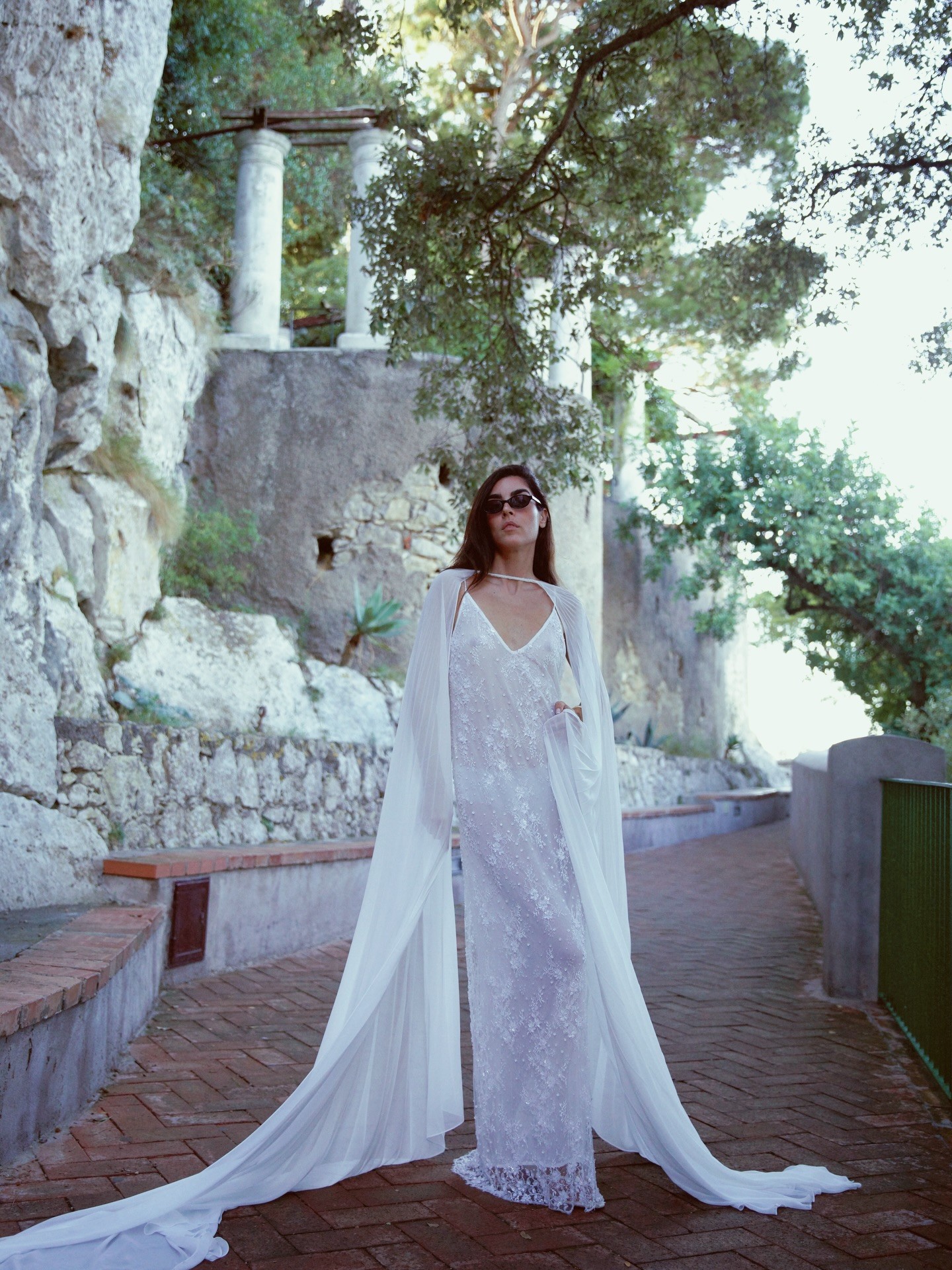 Ο ορισμός του modern elegance! Νυφικό από λεπτή δαντέλα και πλισέ μουσελίνα, διακοσμημένο με κρύσταλλα, και με μακριά κάπα. Μόλις το είδε η Τόνια, έκλεισε για μερικά δευτερόλεπτα τα μάτια, χαμογέλασε γλυκά και φαντάστηκε τον εαυτό της να το φορά ενώ ανεβαίνει γεμάτη λάμψη τα σκαλιά της εκκλησίας.