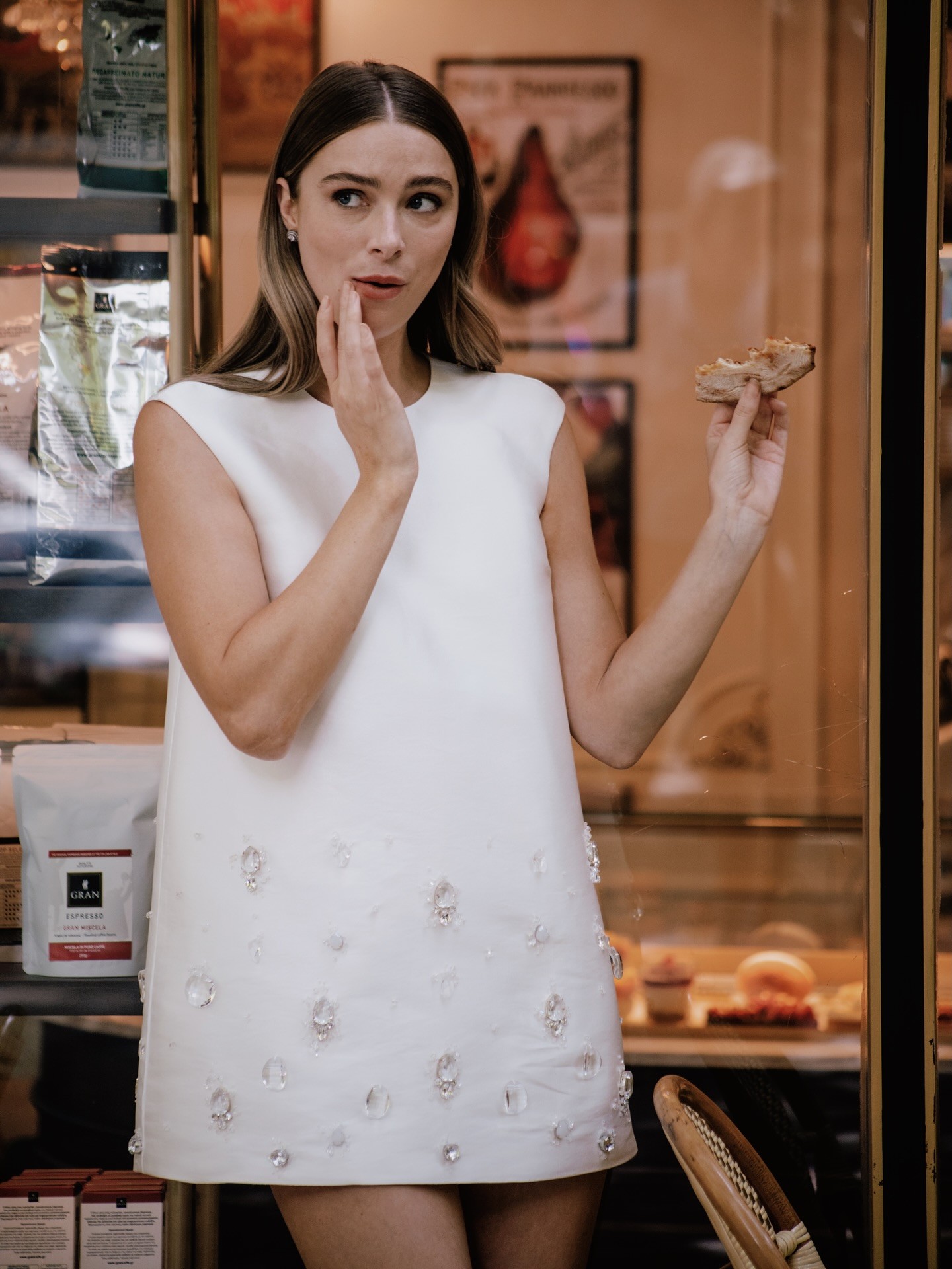 «Τόνια, στο wedding party σου θα άλλαζες νυφικό;», τη ρώτησα και αμέσως απάντησε καταφατικά, λέγοντάς μου ότι αυτό το mini bridal dress φαντάζει ιδανικό στα μάτια της για την περίσταση. Και είναι. Aντανακλά τη sophisticated, σύγχρονη αισθητική της Georgia Sini, και διαθέτει λαμπερά κρύσταλλα για τα απαραίτητα glam vibes στο νυφικό look.