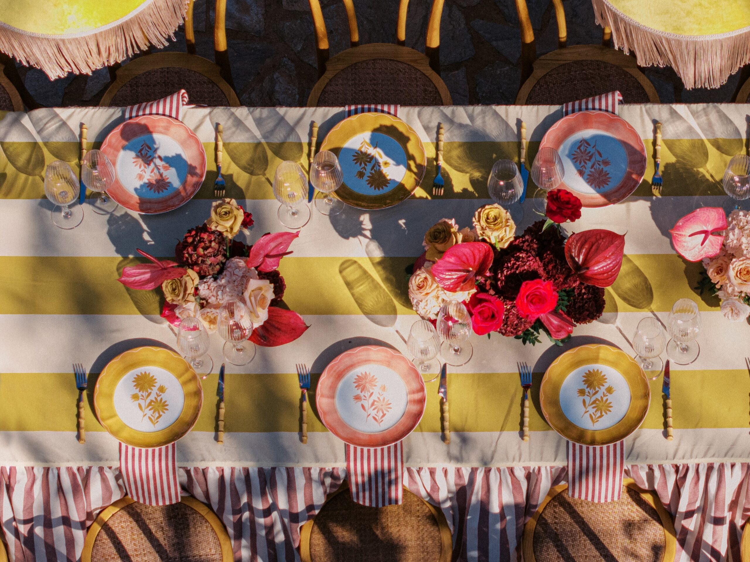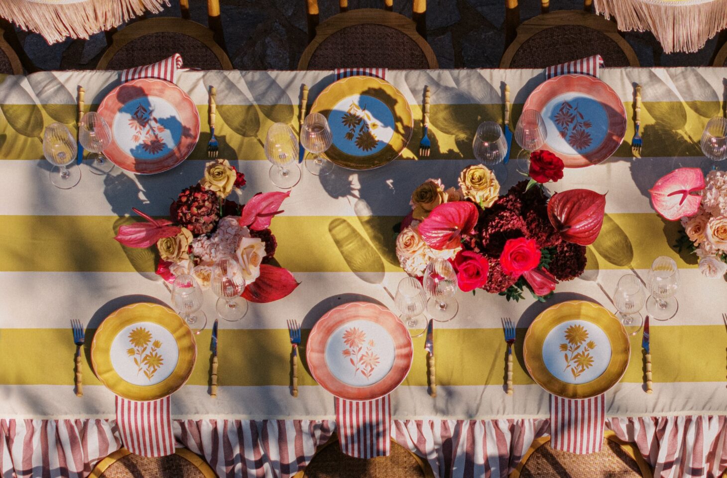 #3 Αν αγαπάτε το χρώμα και είστε trendsetters, ορίστε μία τέλεια ιδέα για το table set-up! Το Island Citrus, που ισορροπεί ανάμεσα στο κίτρινο του λεμονιού και το lime, είναι το wedding color του 2026 και μπορείτε να το εντάξετε στον γάμο σας επιλέγοντας τραπεζομάντηλα στη συγκεκριμένη απόχρωση. Δίπλα σε μαχαιροπίρουνα με bamboo λεπτομέρειες και πολύχρωμα σερβίτσια δείχνει απλά υπέροχο.