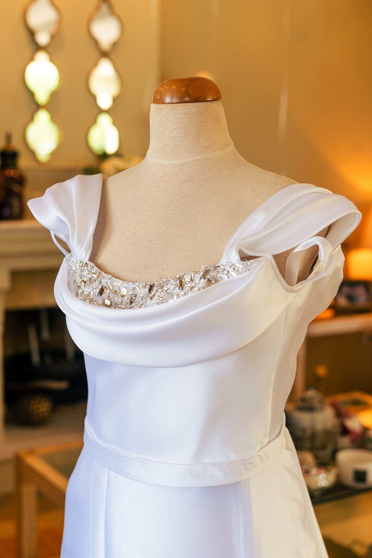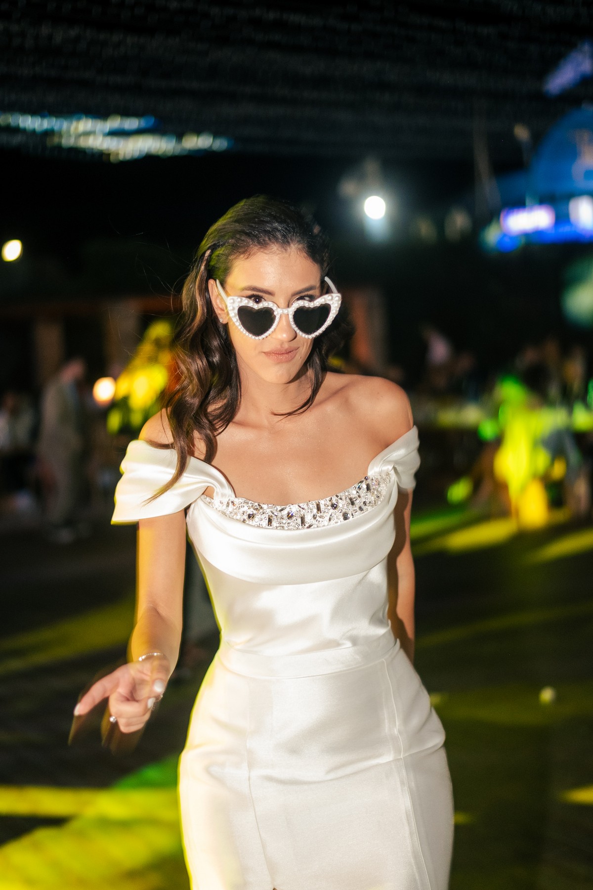 «Το νυφικό μου είχε δύο κομμάτια: μία μακριά φούστα από μεταξωτό mikado, με έντονο σκίσιμο στο πόδι και μπούστο με κρύσταλλα Swarovski κεντητά στο χέρι. Εγώ λοιπόν είδα την πρώτη φορά αυτά τα δύο items στο ατελιέ, όχι μαζί, διαφορετικά συνδυασμένα. Είπα στην Denise ότι μου αρέσει το καθένα ξεχωριστά, και μετά σιγά-σιγά σχεδίασε το gown μου. Το ράψαμε όλο από την αρχή. Της είχα πει ότι θέλω ένα νυφικό για την εκκλησία και “πατώντας” πάνω στο ίδιο, να το διαφοροποιήσουμε, να γίνει κοντό, για το πάρτι, οπότε φτιάξαμε και μία mini φούστα», εξομολογείται η νύφη στο Yes I Do.