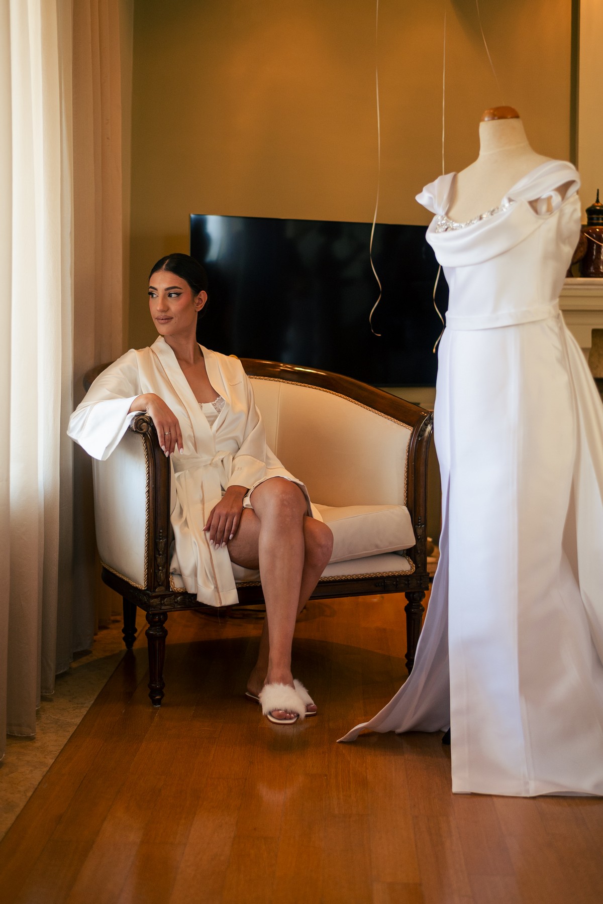 Η Εμμανουέλα έραψε το νυφικό της από την αρχή, πρώτα όμως είχε δει μερικά σχέδια στο showroom της Denise Eleftheriou, και είχε συζητήσει με τη σχεδιάστρια πώς αυτά μπορούν να διαμορφωθούν, ώστε να δημιουργηθεί το «ένα και μοναδικό» νυφικό για εκείνη.