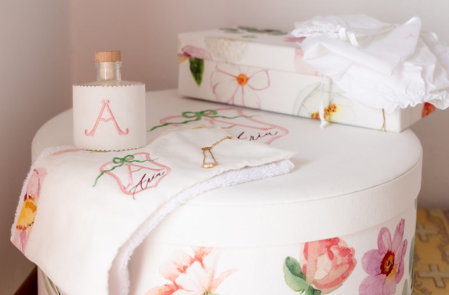 Όπως στη βάπτιση της Ιριάνας και του Οδυσσέα, η Αρετή δημιούργησε με αγάπη το εντυπωσιακό, στρογγυλό κουτί της βάπτισης, τα κεράκια της κολυμπήθρας, το μπουκαλάκι για το λάδι, το κουτί για τα μαρτυρικά, την πετσέτα και την ποδιά του νονού, αυτή τη φορά με έμπνευση από το floral pattern της πρόσκλησης και με κεντημένο στο χέρι το μονόγραμμα της Άριας.