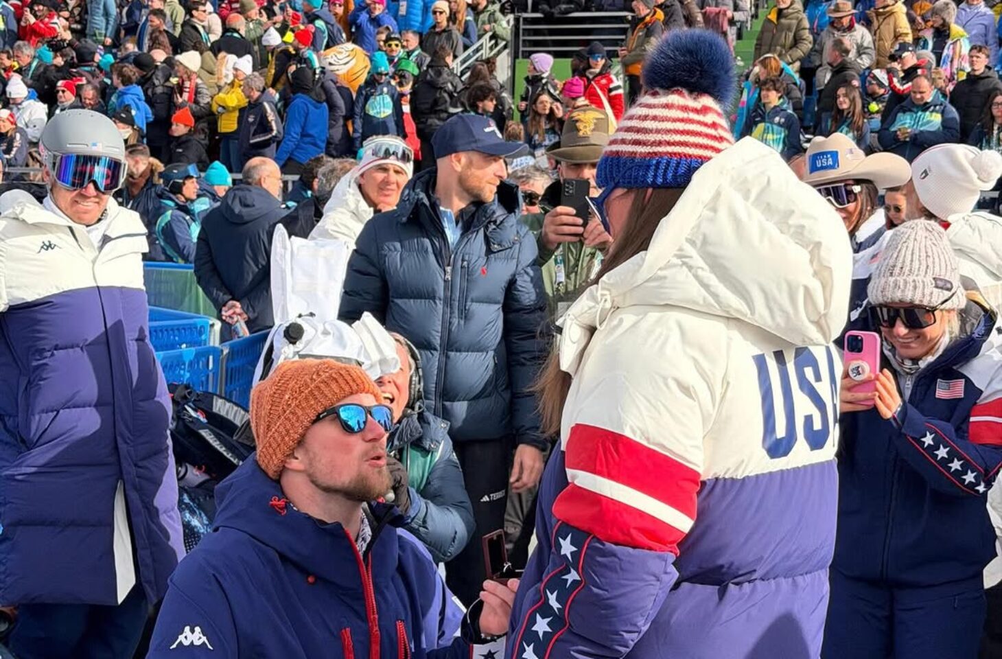 Ο Watkins γονάτισε στην περιοχή τερματισμού περιτριγυρισμένος από σκιέρ και αθλητές από άλλες χώρες και έδωσε στην αγαπημένη του ένα δαχτυλίδι με μία εντυπωσιακή μπλε πέτρα στο κέντρο του. Αφού η Johnson είπε το μεγάλο «ναι», ο Watkins σηκώθηκε και τη φίλησε εν μέσω χειροκροτημάτων από τους παρευρισκόμενους.