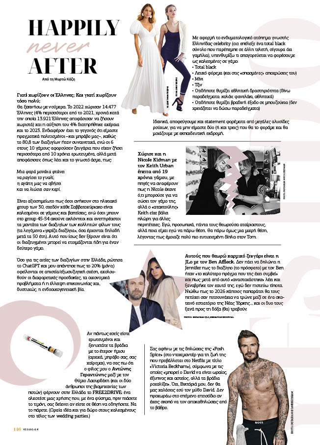 Ποιες είναι οι συχνότερες αιτίες διαζυγίων στην Ελλάδα; Τι απαγορεύεται να φορέσουμε ως καλεσμένες σε γάμο; Ποιο είναι το «ελάττωμα» του David Beckham σύμφωνα με τη Victoria; Αυτά και πολλά ακόμη θα διαβάσετε στη στήλη Happily Never After της Μυρτώ Κάζη στο νέο τεύχος του Yes I Do.