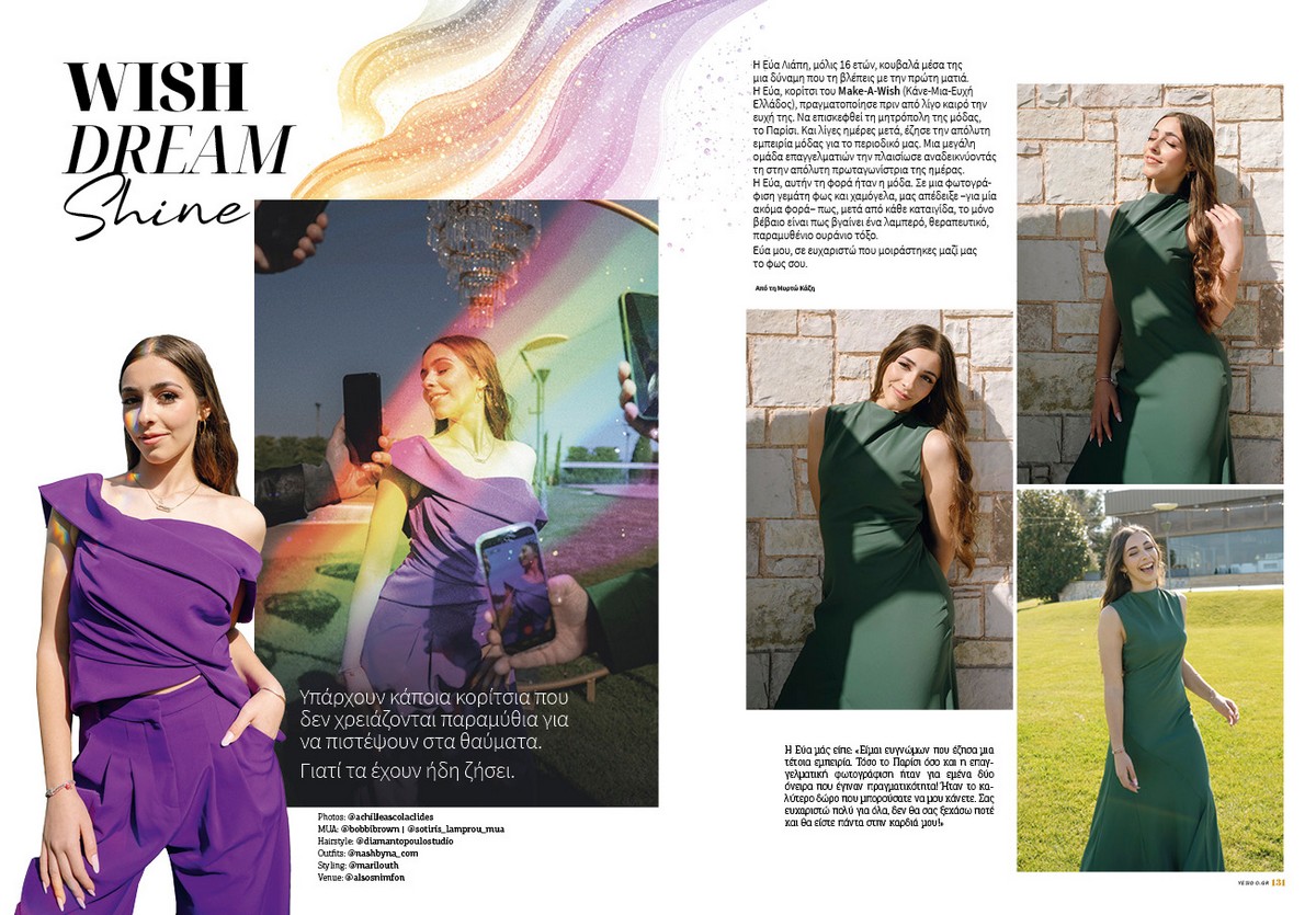 Η Εύα Λιάπη, μόλις 16 ετών, κουβαλά μέσα της μια δύναμη που τη βλέπεις με την πρώτη ματιά. Η Εύα, κορίτσι του Make-A-Wish (Κάνε-Μια-Ευχή Ελλάδος), πραγματοποίησε πριν από λίγο καιρό την ευχή της. Να επισκεφθεί τη μητρόπολη της μόδας, το Παρίσι. Και λίγες ημέρες μετά, έζησε την απόλυτη εμπειρία μόδας για το περιοδικό μας.