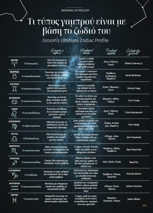 Δίνει μεγάλη σημασία στις παραδόσεις ή του αρέσει να φέρνει τη φρεσκάδα και την καινοτομία στη σχέση σας; Θα επέλεγε slim fit κοστούμι σε navy blue χρώμα για τον γάμο σας ή ένα πιο χαλαρό outfit με casual chic κοστούμι και πουκάμισο χωρίς γραβάτα; Ο παρακάτω πίνακας θα σε βοηθήσει να μάθεις τι τύπος γαμπρού θα είναι ο αγαπημένος σου με βάση τον αστρολογικό χάρτη του!